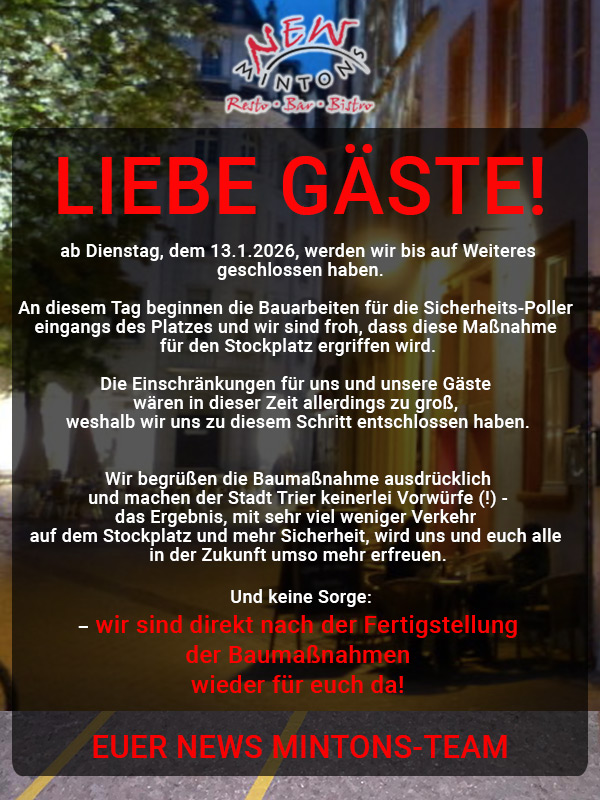 Zentral in Trier am Stockplatz, direkt am Anfang der Trierer Fußgängerzone, befindet sich unser NEW MINTONS: Seit Jahren eine echte Institution für Alle!